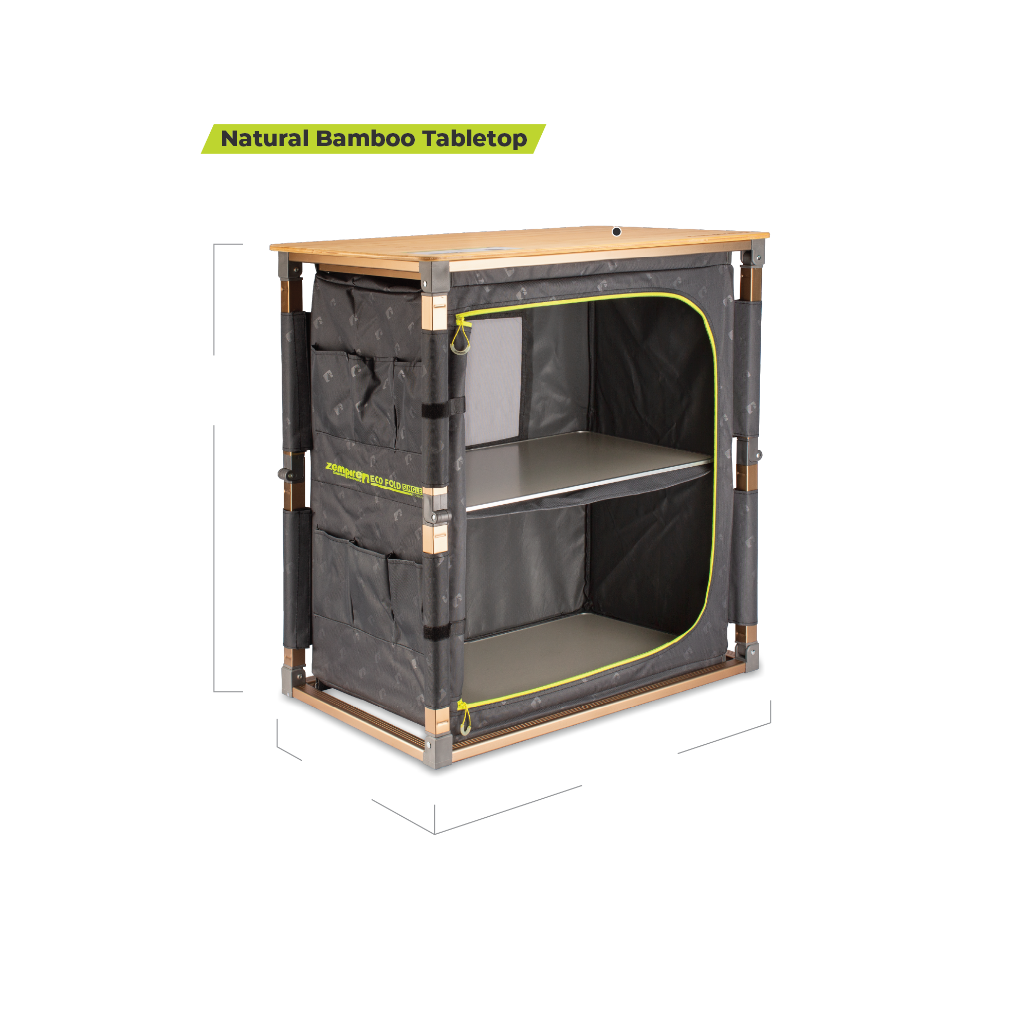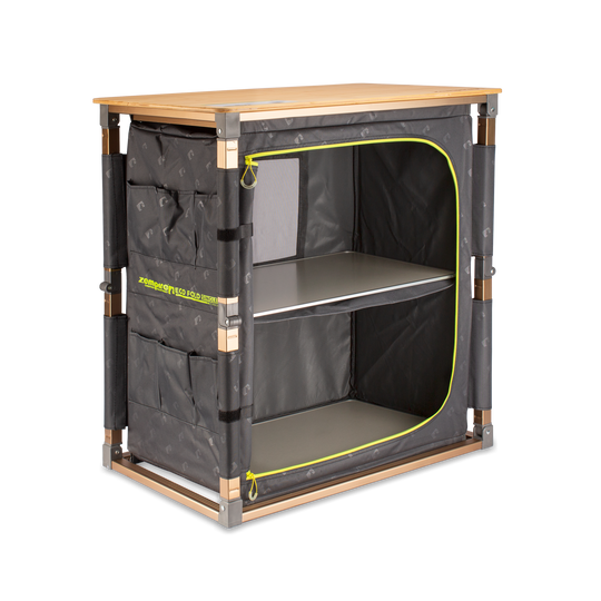 The Eco Fold Single V2 features a naturally weatherproof and heat-resistant bamboo tabletop and rustproof aluminium frame. A perfect working surface to cook and prepare camp meals. The zip-closed lower cupboard, along with side storage pockets, help to help keep your campsite organised. A retractable utility rack keeps utensils close at hand and can also store a basin for wash-up.