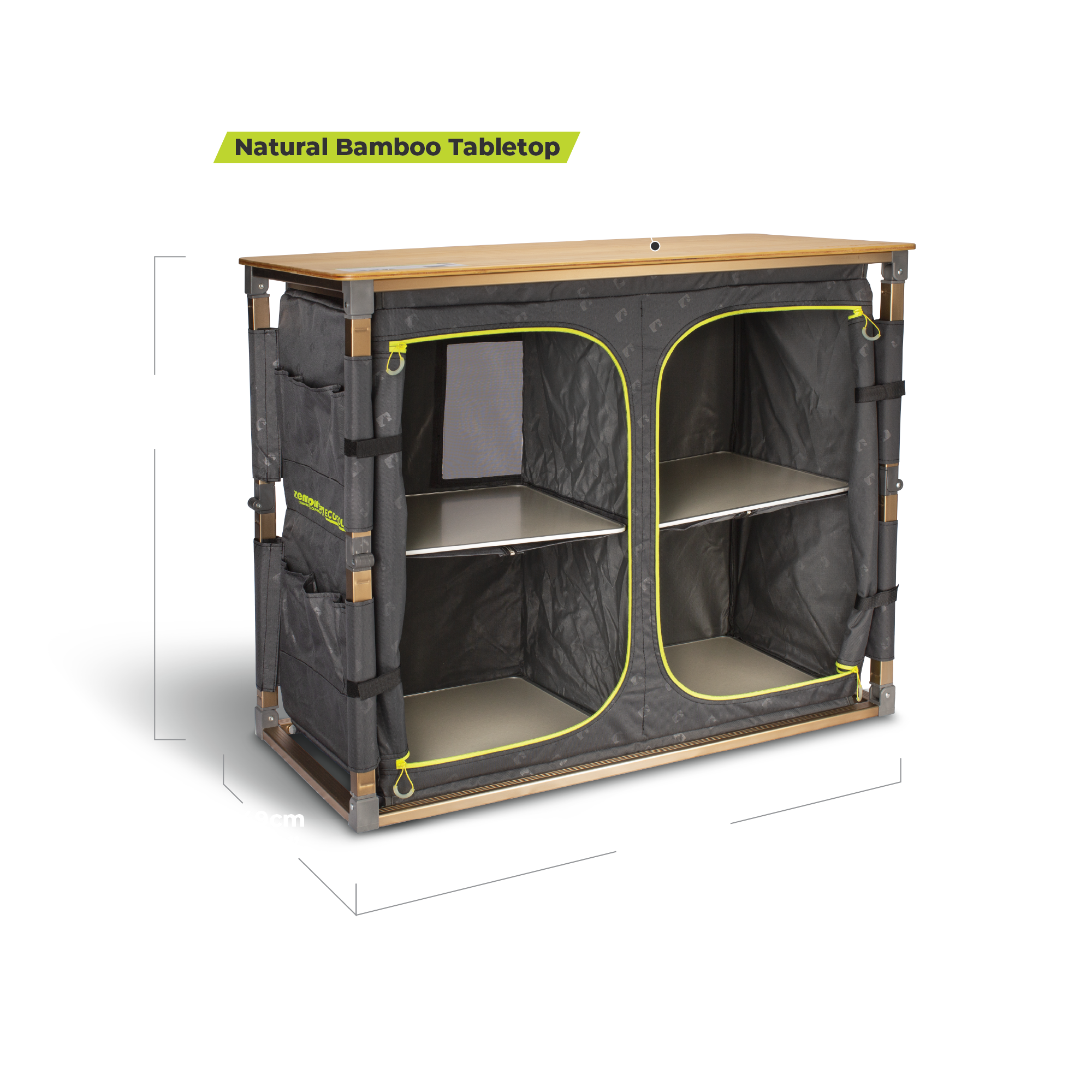 The Eco Fold Twin V2 features a naturally weatherproof and heat-resistant bamboo tabletop and rustproof aluminium frame. A perfect working surface to cook and prepare camp meals. The twin lower cupboards, along with side storage pockets, help to help keep your campsite organised. A retractable utility rack keeps utensils close at hand and can also store a basin for wash-up.
