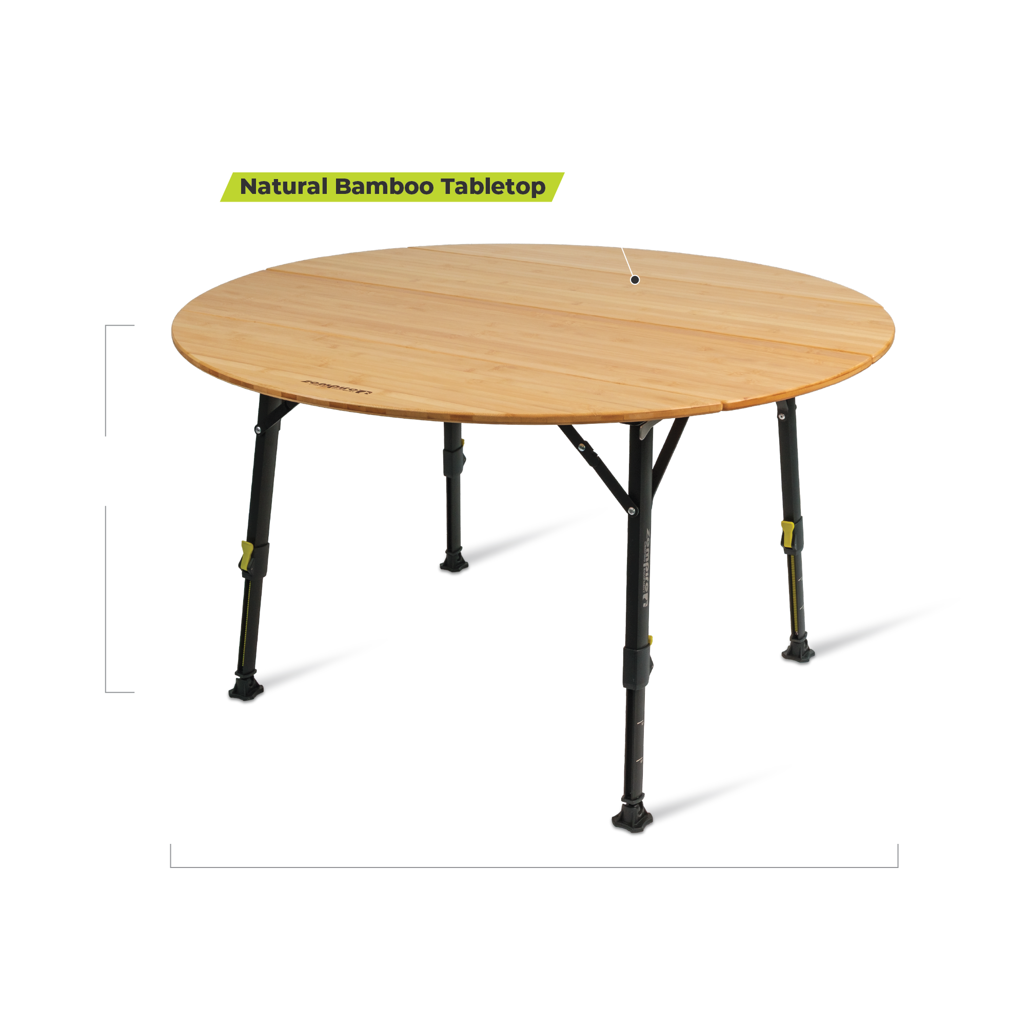 The Zempire Kitpac Pro Round Camping Table is the newest addition to the Kitpac series, built for stability and style. With a unique round design, strong aluminium frame, natural bamboo tabletop, adjustable height, and compact fold-down function, this table is perfect for campsite meals, drinks, games and more. Includes a built-in bottle opener for added convenience.