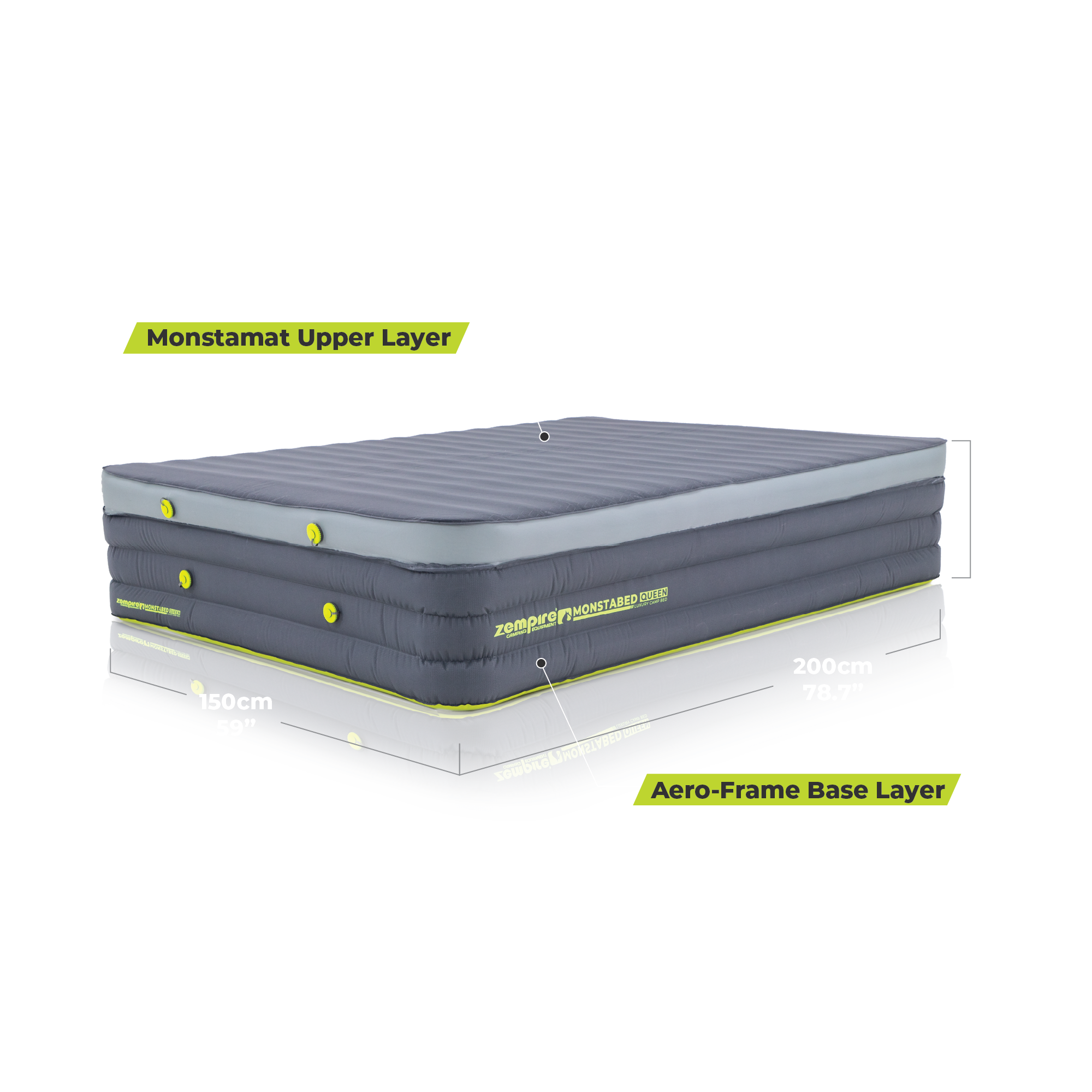 The Zempire Monstabed queen is a premium camping mattress that combines the comfort of our Monstamat camping mat with the support of a durable inflatable airbed base. Designed as a spacious camp bed for two, it delivers home-like comfort without the need for a stretcher. This all-in-one camp bedding solution packs into a single carry bag for easy transport and inflates effortlessly with the Monstapump (sold separately). Experience next-level sleep at the campsite with this innovative airbed system.