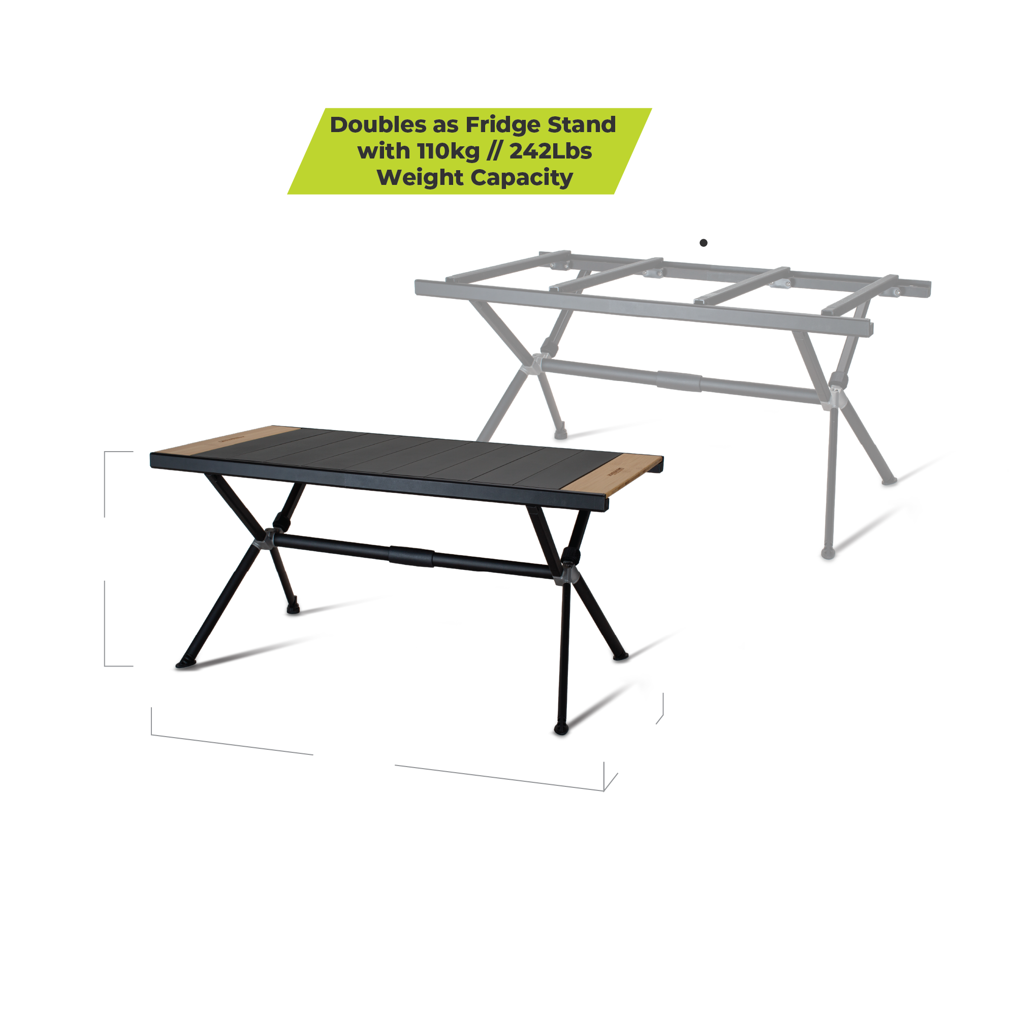 The Stealthpac 95 is our most versatile camping table. Designed with efficiency at the forefront, the Stealthpac 95 serves as a dual-purpose camping table. The size is super compact and lightweight making it ideal to use as a coffee table. In addition, with sturdy stabilisation bars and a whopping 110kg weight capacity, it doubles as a fridge stand. The tabletop is simple to attach and fold away making the transition from the coffee table to the fridge stand seamless.